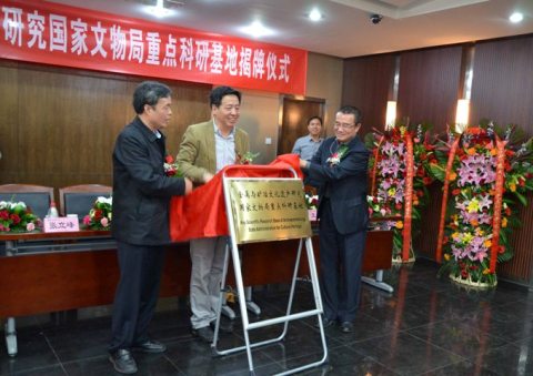宋新潮副局长、罗维东书记、王有泉处长一起为金属与矿冶文化遗产研究国家文物局重点科研基地揭牌。