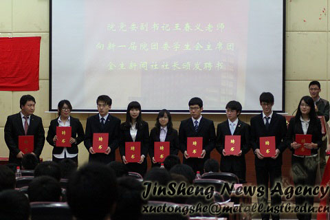 金生新闻社上届社长李克非代表上届团学组织主要负责人发言,表达了前辈们对新一届团学组织的热切关爱,同时也提出了自己的建议和经验。在为学生团委副书记、学生会主席团、金生新闻社社长团及各部门部长颁发聘书后,新任学生会主席孙德鹏和金生新闻社社长王伊琳分别表达了对未来工作的展望、规划。