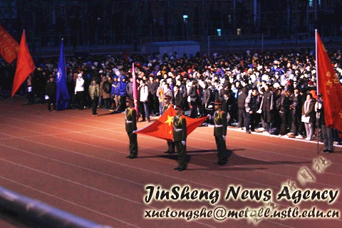 随着国歌的响起,同学们都双目凝视着鲜艳的五星红旗,看着她在寒风中缓缓上升。此时,旁边晨练打篮球的同学也停了下来向国旗行注目礼。随后,在学生代表的引领下,全体学生雄壮深情地朗诵了诗歌《青春中国》。