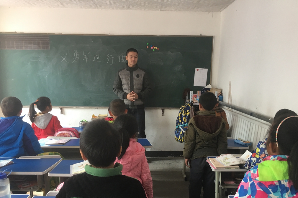 11月3日下午,“星火传递”小分队照常出现在了屯佃育华小学的课堂中。这次志愿老师们采取男女组队的方式来教唱歌曲,为了培养同学们的使命感和光荣感,志愿者们选择教唱国歌。