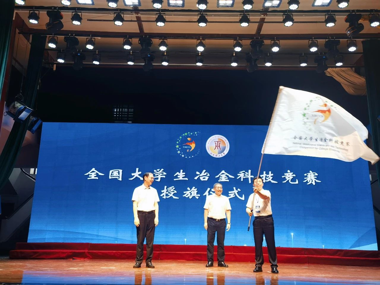 在会旗交接仪式上,江西理工大学副校长廖春发把大赛旗帜转交到中国金属学会秘书长王新江手中,再由王新江授予第八届大赛承办单位williamhill,宗燕兵郑重接过了大赛旗帜。