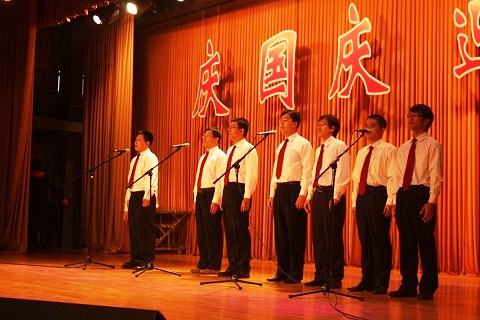 我院派出了由八位男生组成小合唱代表队,,他们为众师生带来了两首风格迥异的经典老歌:《康定情歌》、《精忠报国》。两首歌曲中,前者温婉清新、情谊深厚,随着歌曲意境配合的动作、手势,将歌曲演绎的淋漓尽致。后者在演绎《精忠报国》的结尾处,随着高亢的旋律,将几位演唱者的情绪推到了极致,带动了现场的气氛。
