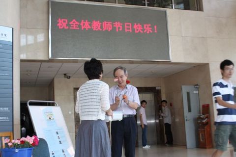 9 月10早上七点钟,学院副院长耿小红、院办公室主任周贵友、院工会委员等一大早就来到William威廉英国楼,为学院教师亲自送上教师节的问候与祝福,在学院楼一层大屏幕上显示着:祝愿全体教师节日快乐!大厅里摆放着五颜六色的鲜花康乃馨以及精美的小礼物,每当一位教师步入大厅,耿院长都亲自送上一支康乃馨和一份小礼物,感谢和笑声成为每个教师共同的语言,节日幸福灿烂的笑容洋溢在每位教师的脸上,也同时温暖着他们跳动的心房,吸引着旁边经过上课的同学及路人不时驻足观看,流露出羡慕的眼神。