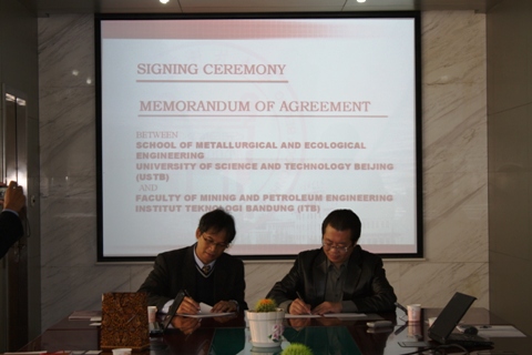 2012年11月1日上午8:30,我院与印尼万隆理工大学合作协议签定仪式在冶金楼318举行。我院出席仪式的有我校国际合作与交流处郭侃俊副处长、我院院长张立峰教授、院党委书记宋波教授、副院长王福明教授、副院长兼党委副书记耿小红、院长助理潜伟教授、生态科学与工程系主任苍大强教授、生态科学与工程系副主任李宏煦教授等,万隆理工大学方面有矿业与石油学院院长Sri Widiyantoro教授和副院长Ir.Eddy Agus Basuki教授等人出席。