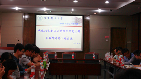 4月29日,北京交通大学理学院来我院进行党建工作交流。交流活动在冶金楼青钢报告厅进行。出席交流会议的人员有北京交通大学理学院代理团委书记杨涛、党建辅导员李兴友、我院团委书记张瑜、党建辅导员郝勇飞以及两个学院26名学生党员参加了交流会议。会议由郝勇飞主持。