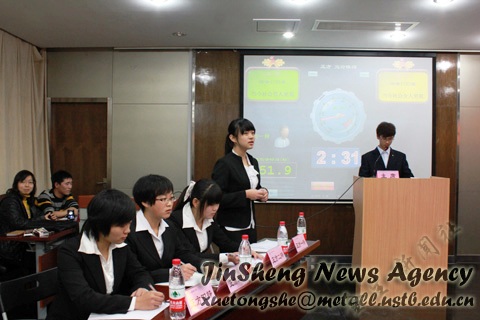 2011年12月3日晚7点,我院“钢魂杯”新生辩论赛半决赛在青钢报告厅顺利举行。出席本场比赛的评委有:院团委学生副书记陈炽昱、连聪,院学生会副主席汪毅捷、08级院辩论队队员柴琳、09级院辩论队队员陆鹿和朱经纬。