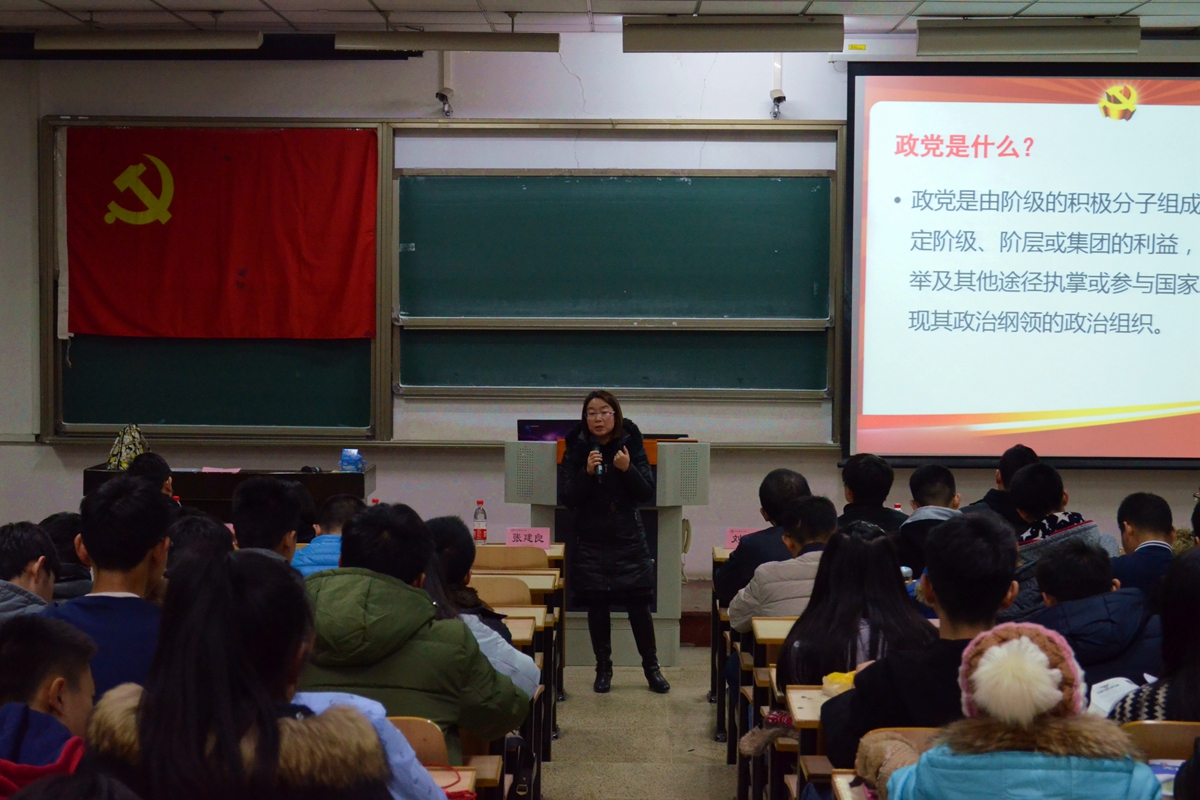 williamhill第271期学生业余党校第一讲正式开始。马克思主义学院副院长刘丽敏老师先从当代大学生不同的入党动动机讲起,纠正了部分学子为求职、从政等现实条件的便利而选择入党错误认识,强调了端正入党动机的重要性。同时,刘丽敏老师还举出现任科学技术部部长万钢同志以及前卫生部部长陈竺同志从无党派人士到入党从政的历程,给在场学子道出了未来从政政治条件广阔的现实情况进一步纠正了同学们的错误认识。在场的同学无不纷纷点头认同,对刘丽敏老师表示认同。紧接着,刘丽敏老师从“十八大”“两会”“十一届三中全会”等基础名词与同学们进行互动,回顾了政治基础知识,进一步加深对了解中国共产党的运作架构。而后,刘丽敏老师从对党章的基本认识、党章修改历程的回顾以及修改党章的必要性、解读新党章、实践党章争做合格党员四个部分带领给在场的同学系统地学习了党的宪法――党章,强调了“纪在法先”的基本概念。刘丽敏老师谈及修改党章的必要性时说道,修改党章是党总结经验不断进步,在统一思想的前提下积极推进视野的重要举措;在解读新党章这部分,刘丽敏老师呼吁在场的老师和同学们贯彻落实中共“两学一做”的号召投身于实践中去,同时给我们解读了十八大带来的新政策和新思想。在最后,刘丽敏老师鼓励我们积极实践党章,从中国共产党以及作为一个共产党员的应然概念中,提出了我们应争做一个除了有公民使命感以及道德良性素养的“好人”,还具备党性素养以及党识的人的希冀,积极投身于拥护中国共产党的行列中去,自信自强。在刘丽敏老师的美好祝愿与同学们的热烈掌声下,williamhill第271期学生业余党校第一讲至此结束。