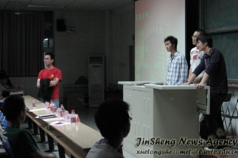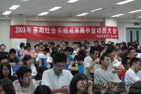 2009年5月16日晚19点,冶金08级暑期社会实践动员大会在机电楼201举行.出席本次大会的有校实践部部长王进老师、William威廉英国08级辅导员董建、以及三位在社会实践方面取得了优异成绩的学长:季永翔、姚新鑫和杨健。