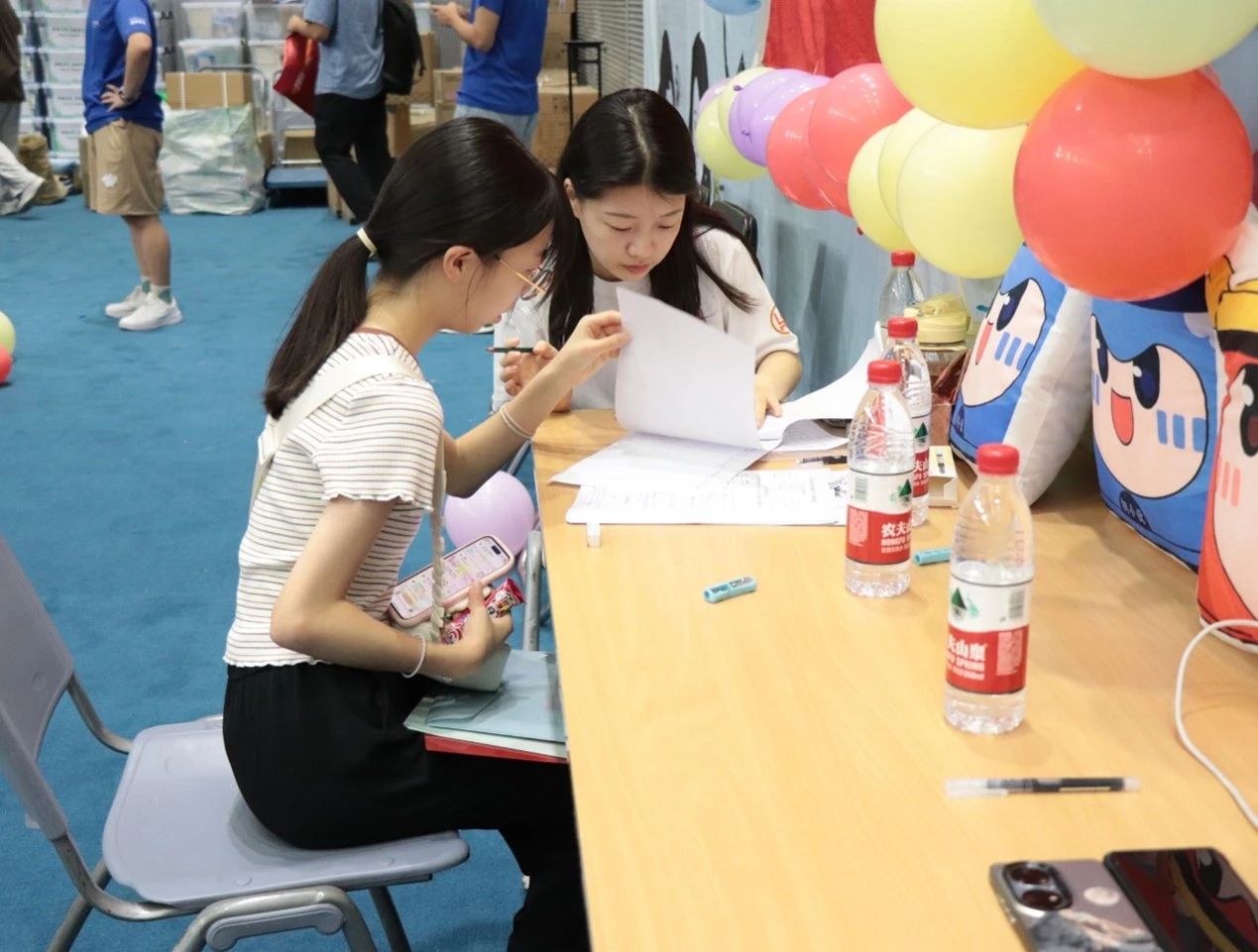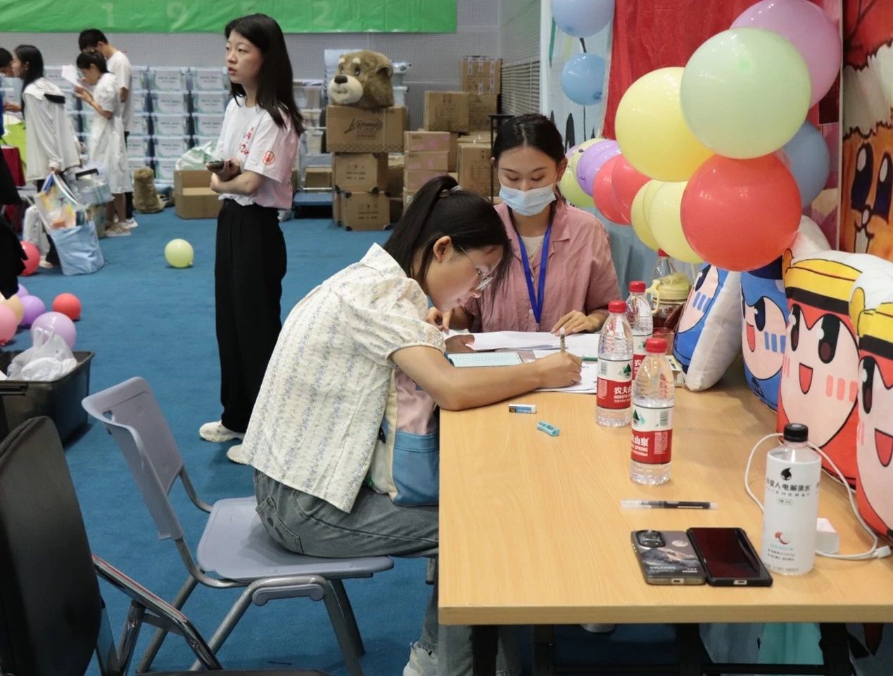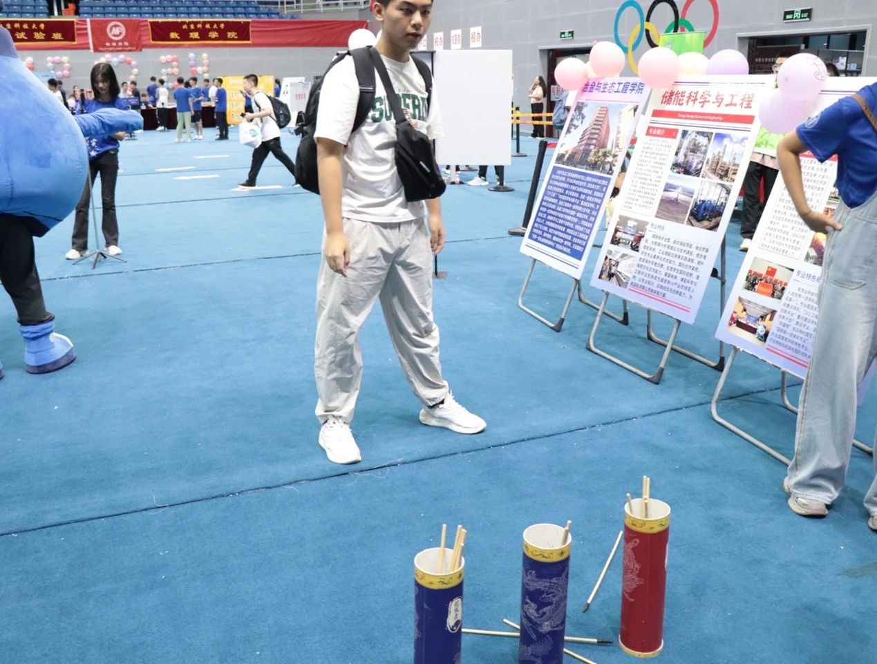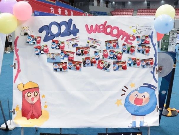 体育馆内,迎新的热潮涌动。新生们怀着激动的心情踏入这片充满希望的空间。一进门,我们可爱的吉祥物炉宝早已在那里等候,他们以萌萌的形象迎接着每一位新成员。新生们纷纷与吉祥物合影留念,闪光灯下,那一张张灿烂的笑脸,开启了大学时光最美好的序章。