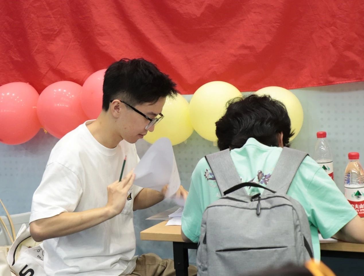 交完档案,走绿色通道的新生在辅导员的帮助下填表,一句句亲切的问候,是学校、学院对学生最深的爱。