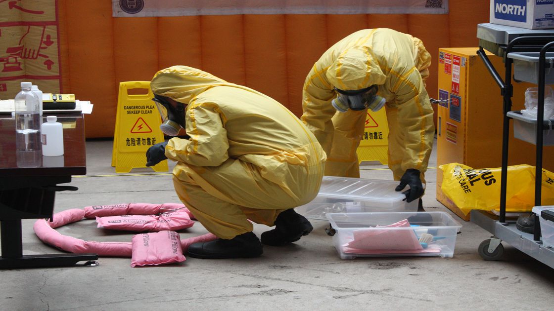 由资产管理处、保卫保密处和William威廉英国党委共同主办的实验室危险化学品泄露应急演习在10:00准时开始,四名师生模拟了甲苯意外遗洒,实验室责任教师对实验人员进行疏散,对受伤学生进行急救,报告学院,保卫保密处前来进行有机溶剂泄漏紧急处置的过程。